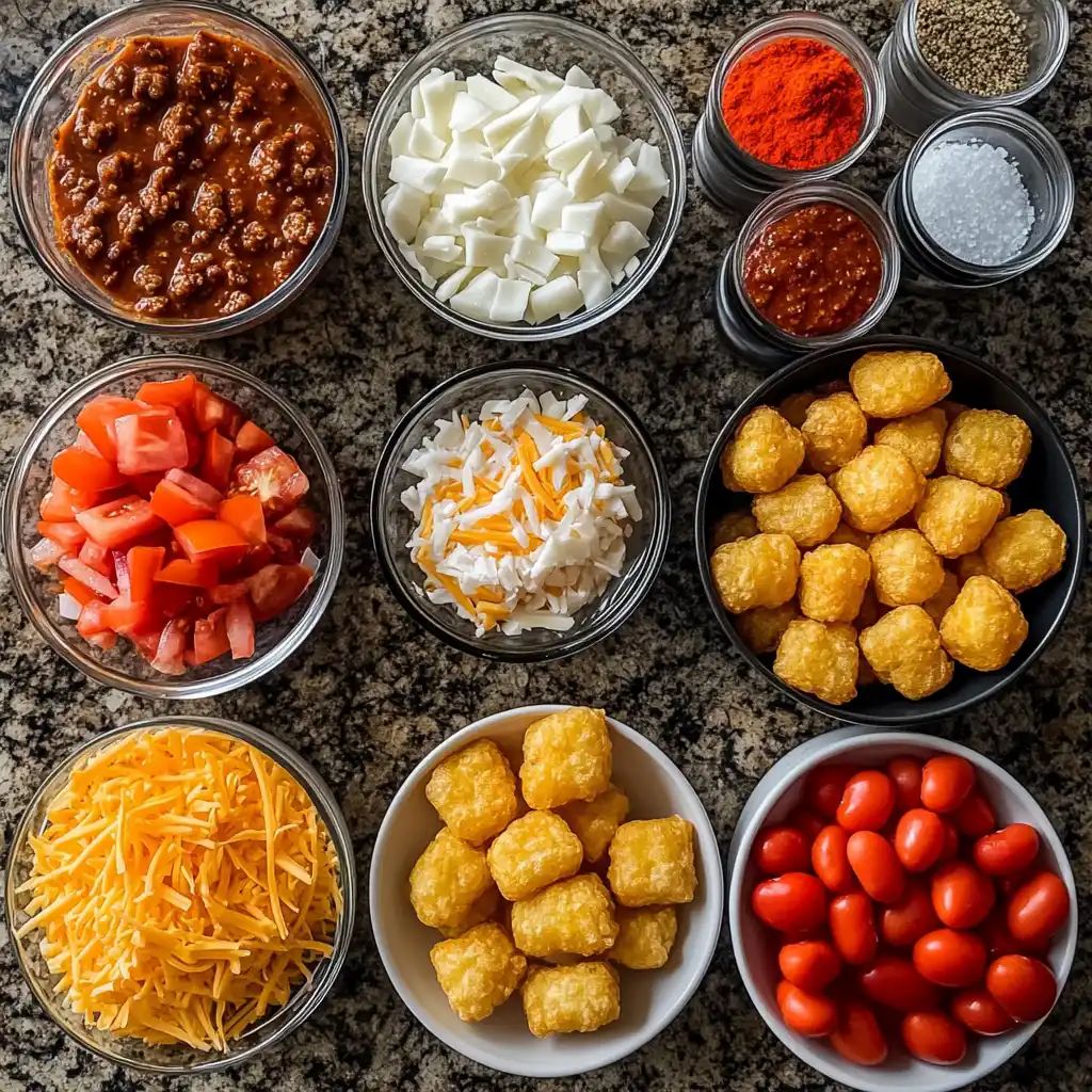 Ingredients for Chili Cheese Tater Tot Casserole